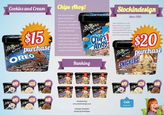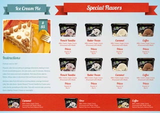 This document contains information about ice cream flavors, prices, and an ice cream pie recipe. It lists several ice cream flavors including French vanilla, butter pecan, caramel, and coffee along with their ingredients. The prices for regular and big containers are provided. The document also includes instructions for making an ice cream pie using two cake layers with French vanilla ice cream in between, which is then frozen for at least five hours.