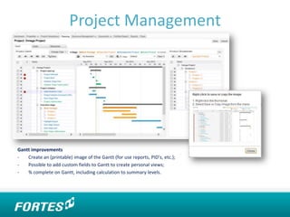 The document summarizes new features and improvements for Release 6.5 of the Principal Toolbox project management software. Key updates include enhancements to Gantt charts, document management, logs, resource management, reporting, and support for migrations between project models. Additional changes provide new report widgets, custom field types, back button functionality, portfolio dashboards, dependency reports, and user group support.