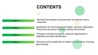 The document discusses various aspects of microbial fermentation, genetic engineering, and immunological principles, including applications related to vaccines, diagnostics, and transgenic organisms. It presents questions and answers regarding the production of monoclonal antibodies, immune responses, plant tissue culture, and the role of various genes in plant and animal biotechnology. The content covers multiple-choice questions from different years, reflecting academic examinations in biotechnology and molecular biology.
