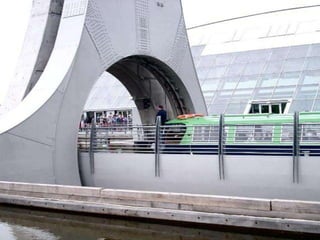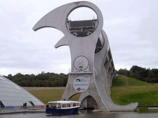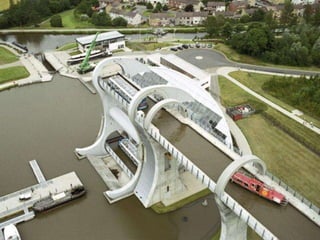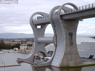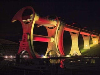 The document summarizes the history and operation of the Falkirk Wheel, a rotating boat lift that connects the Forth and Clyde Canal with the Union Canal in Scotland. It describes how the two original canals were connected by 11 locks due to elevation changes, and how in 2002 an extraordinary rotating boat transporter was completed that saves time and energy compared to the locks. The wheel has two arms that form huge water-filled tubs, and it uses Archimedes' law of buoyancy to balance the tubs and rotate boats between the upper and lower canals within 15 minutes using only 1.5 kWh of energy.
