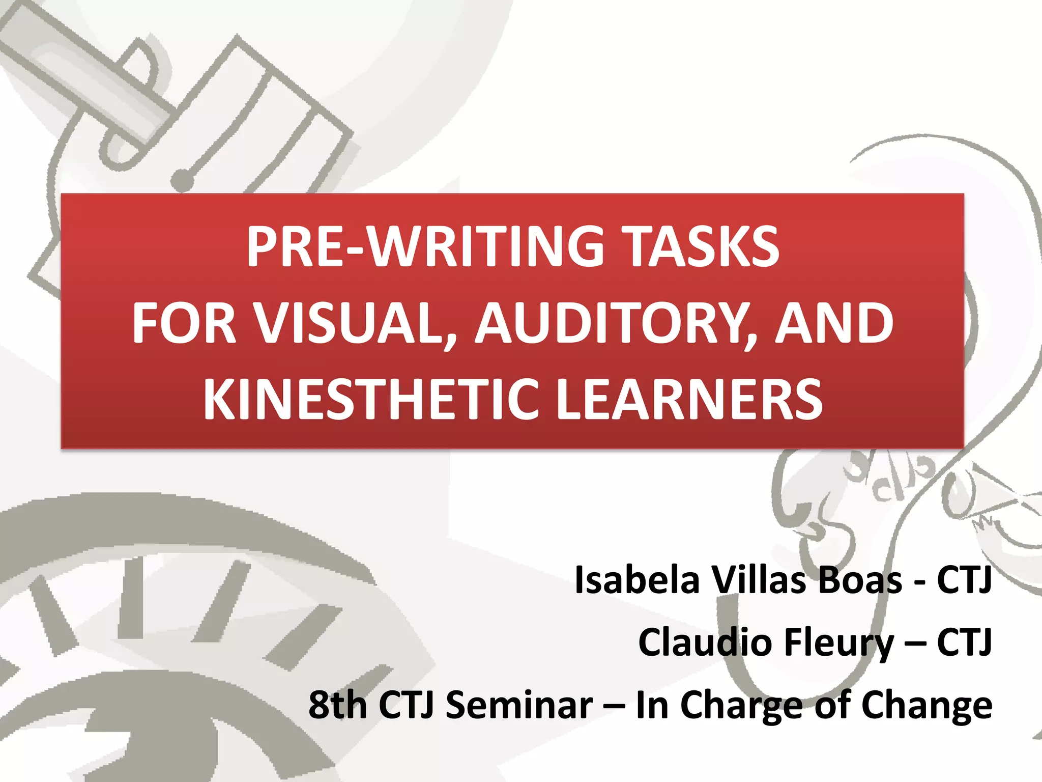 The document provides information and activities for visual, auditory, and kinesthetic learners to help with pre-writing tasks. It discusses learning styles and defines them. Example activities are presented that incorporate different learning styles, such as using a voice recorder for auditory learners or forming groups to move around for kinesthetic learners. The document aims to show the connection between pre-writing activities and accommodating different learning styles.