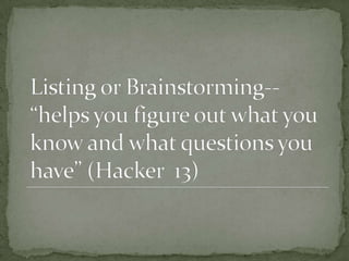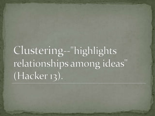 The document discusses various prewriting techniques to help discover what you want to say without anxiety, including brainstorming, focused freewriting, and clustering. It mentions making lists of everything that comes to mind about the topic without self-criticism. Clustering involves writing the topic in the center and surrounding it with related ideas, trusting your own connections between ideas.