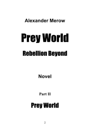 The document is the English version of the second book in Alexander Merow's 'Prey World' series, detailing a dystopian narrative focused on Japan's fight against a world government. It explores the political struggles and fears of Japanese President Haruto Matsumoto as he navigates international media criticism and prepares for potential conflict. Meanwhile, two rebels, Frank Kohlhaas and Alfred Bäumer, seek refuge in Lithuania, while an elite council of powerful individuals discusses strategies to maintain control over society.