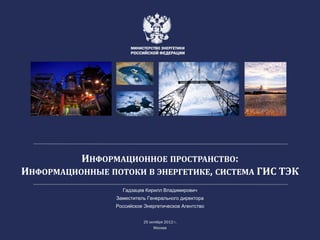 Документ рассматривает информационные потоки в топливно-энергетическом комплексе (ТЭК) России и недостатки существующих информационных систем, такие как разрозненность и недостоверность данных. Приводится информация о создании Государственной информационной системы ТЭК, которая будет интегрирована с многочисленными органами власти для повышения эффективности сбора и анализа данных. Ожидается, что к 2020 году большинство объектов ТЭК будут предоставлять необходимую информацию в систему ежемесячно.