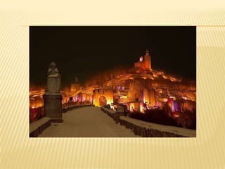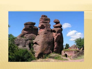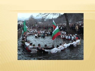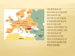 Bulgaria is a country located in Southeastern Europe, bordered by Romania, Serbia, Macedonia, Greece, and Turkey. It has a diverse landscape that includes mountains, beaches, lakes, and plains across its 111,000 square kilometers. Bulgaria has a long history dating back to ancient Thracian and Roman civilizations, and is known for natural beauty along its Black Sea coast, historical sites like the Madara Rider carving and Nesebar old town, and for traditions like folk dancing and being the birthplace of the Cyrillic alphabet.