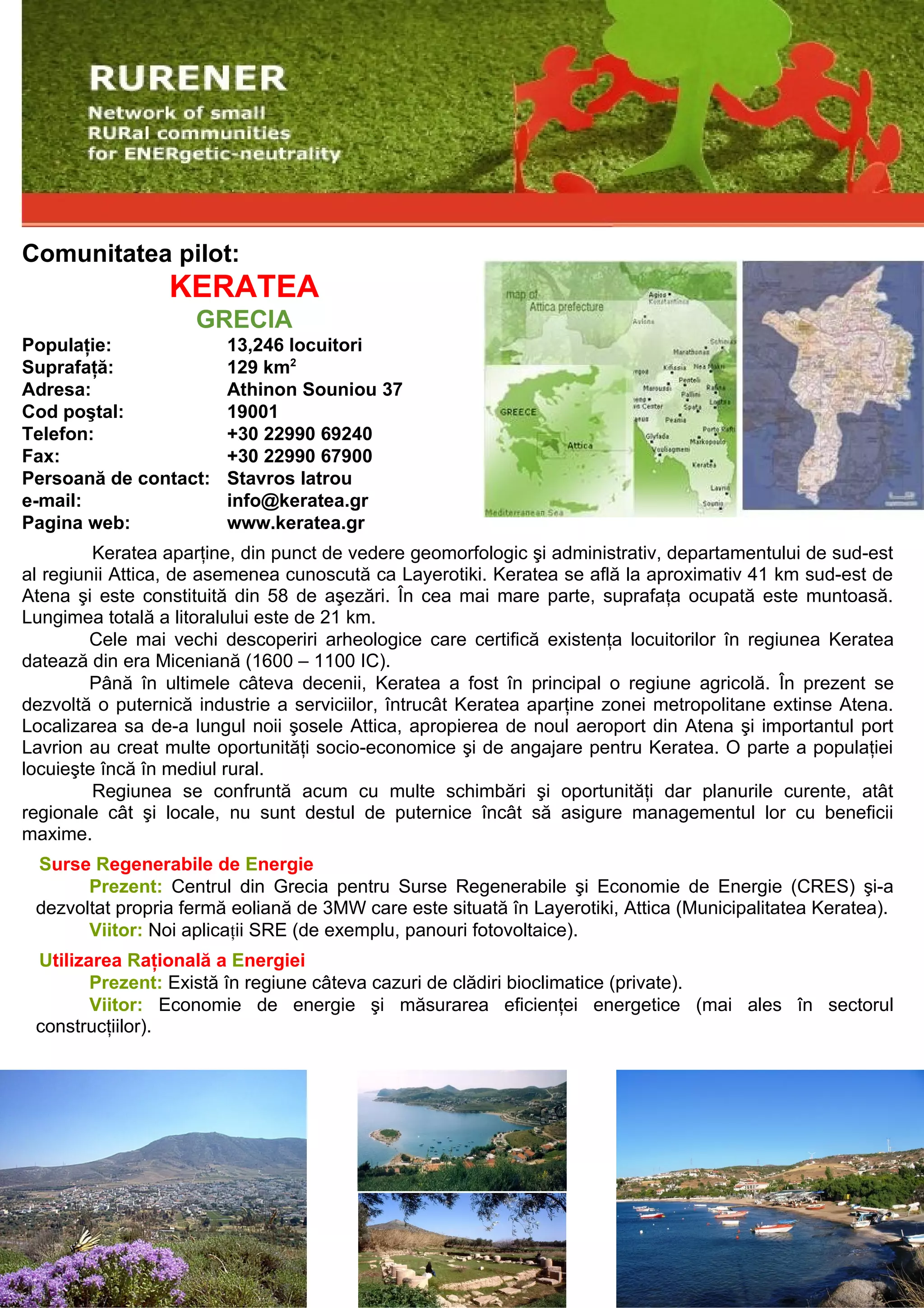 Keratea este o comunitate din Grecia cu o populație de 13,246 locuitori și o suprafață de 129 km², situată la aproximativ 41 km sud-est de Atena. Regiunea, care a fost predominant agricolă, se dezvoltă acum în direcția industriei serviciilor datorită proximității față de Atena, noul aeroport și portul Lavrion. În prezent, există inițiative pentru utilizarea surselor regenerabile de energie, inclusiv o fermă eoliană, și se promovează economisirea și eficiența energetică în sectorul construcțiilor.