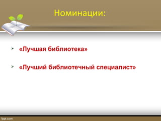 Документ описывает ежегодный конкурс среди библиотек Орловской области за 2015 год с номинациями на лучшую библиотеку и библиотечного специалиста. В конкурсе принимали участие 13 муниципальных библиотек и 13 специалистов, с различными подноминациями. Победители награждаются грамотами и призами, такими как электронные книги и планшеты.
