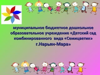 Детский сад комбинированного вида «Семицветик» в Нарьяне-Маре был основан в 2009 году и лицензирован на 300 мест, фактически он обслуживает 296 детей с 15 группами. Учебный процесс поддерживается разнообразными методическими кабинетами и спортивными базами, а также квалифицированным персоналом, 50% из которых имеют высшее образование. Коллектив садика участвует в различных конкурсах и мероприятиях, достигая успехов в спортивных и творческих областях.
