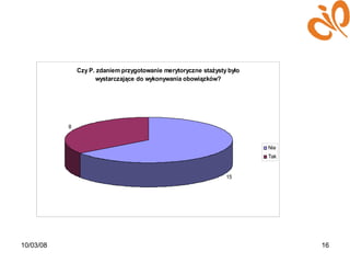 Prezentacja Maciek 1. 2. 3. Czy organizacja staży służy transferowi wiedzy i innowacyjności pomiędzy sektorem B+R a przedsiębiorstwami regionu dla obopólnych korzyści? Czy organizacja staży przyczynia się do wzrostu konkurencyjności firm? Czy organizacja staży przyczynia się do wzrostu konkurencyjności pozycji zawodowej absolwentów na rynku pracy? Czy organizacja staży stanowi skuteczne przedłużenie edukacji (przyczynia się do nabycia umiejętności praktycznych)? 4. Realizacja badań Okres realizacji badań 02-07 2007 Terminy wywiadów Grupy respondentów 5. Metody zbierania informacji i analizy danych 6. Zbieranie informacji Pogłębione wywiady indywidualne (IDI) Rejestracja treści wywiadu Swoboda wypowiedzi Otwarta forma pytań Pogłębianie pytań Transkrypcja wywiadu 7. 8. 9. 10. 11. 12. 13. 14. 15. 16. 17.