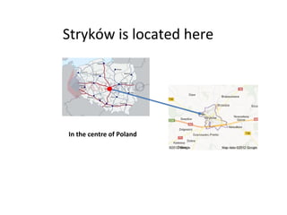 Stryków is located in the center of Poland and contains Gothic and Baroque churches of the Roman Catholic faith. The town features a flag, emblem, and the only monument of a book found in Poland. Visitors can learn more by clicking on links about the town and local school.