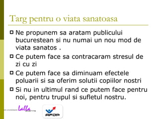 Între 29 și 31 mai 2009, Muzeul Țăranului Român organizează un târg dedicat unui stil de viață sănătos, având ca scop educarea publicului asupra soluțiilor pentru stres, poluare și bunăstare personală. Evenimentul va include expozanți din diverse domenii, workshop-uri pe teme precum nutriție și terapii naturiste, și va colabora cu asociația maimultverde pentru promovarea unui mediu sănătos. O parte din veniturile obținute va fi donată organizației maimultverde, care se angajează în activități ecologice și educaționale.