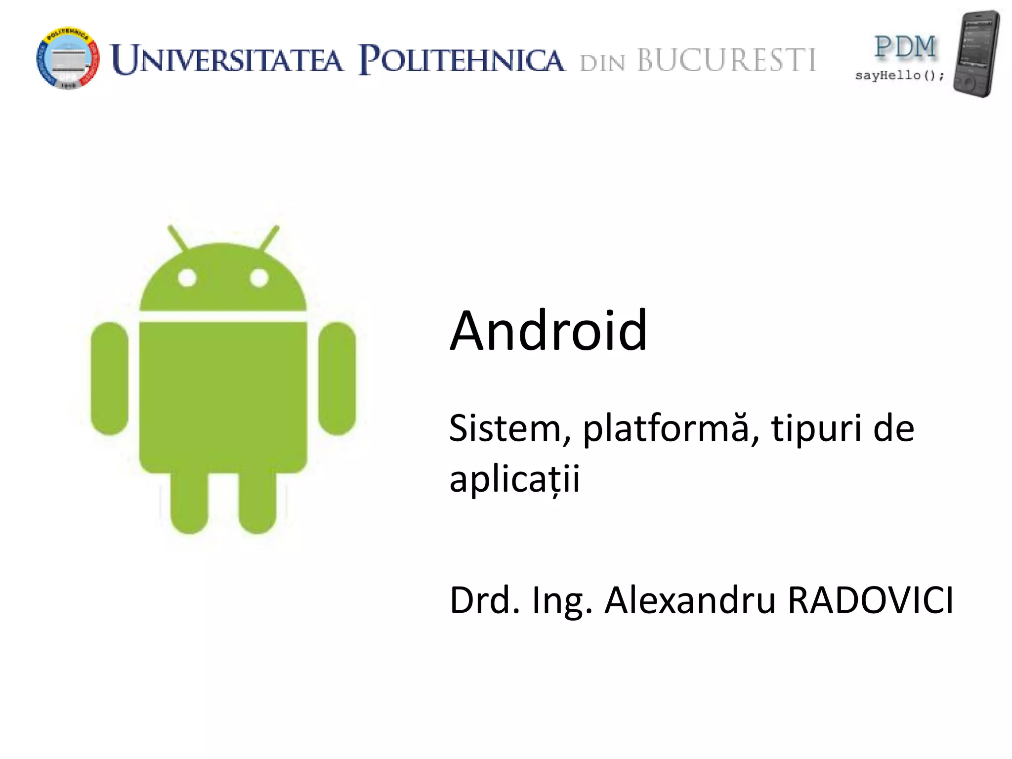 Documentul oferă o prezentare generală a platformei Android, detaliind arhitectura sa, tipurile de aplicații și modul de programare. Acesta discută despre kernel, biblioteci utilizator, runtime-ul Dalvik și securitatea aplicațiilor, subliniind diferitele niveluri de acces la funcțiile telefonului. În concluzie, Android este un sistem de operare complex, bazat pe Linux, care permite dezvoltarea de aplicații variate prin multiple modalități de programare.