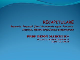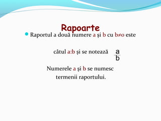 Documentul explică conceptele de raporturi și proporții, definind termenii esențiali și proprietățile acestora. Se discută despre calculul probabilităților, concentrarea substanțelor, și procentele, oferind formule pentru a obține rezultate. De asemenea, sunt prezentate metodele pentru derivarea proporțiilor folosind termeni diferiți.