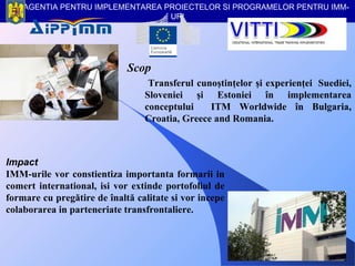 Proiectul vizează transferul de cunoștințe din Suedia, Slovenia și Estonia pentru implementarea conceptului itm worldwide în Bulgaria, Croația, Grecia și România, în scopul formării profesionale în comerțul internațional pentru IMM-uri. Activitățile includ seminarii internaționale, analize de piață și promovarea educației de înaltă calitate pentru IMM-uri, facilitând astfel extinderea acestora pe piețele internaționale. Obstacolul principal întâmpinat de IMM-uri este lipsa abilităților de management, iar obiectivul final este crearea de parteneriate sustenabile între organizațiile de formare profesională și IMM-uri.