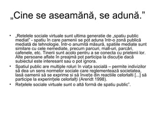 Rețelele sociale virtuale, precum Facebook, oferă utilizatorilor un spațiu pentru a comunica și a păstra legătura cu prietenii, dar totodată înlocuiesc interacțiunile reale și pot duce la probleme psihologice. Facebook, cu peste 400 de milioane de utilizatori, vinde informațiile personale ale utilizatorilor, ridicând întrebări serioase despre confidențialitate și control social. Utilizatorii pot deveni inconștienți participanți în ceea ce se descrie ca o formă de spionaj modern, funcție similară cu conceptul de 'big brother'.