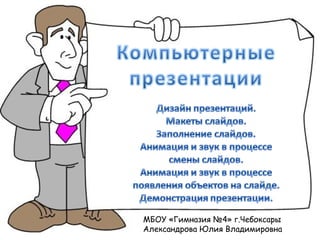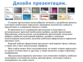 Документ описывает создание презентации, начиная с разработки проекта и выбора дизайна, а также использования различных приложений для презентаций. Он рассматривает типы слайдов, их оформление, размещение объектов и анимацию, подчеркивая важность интерактивных элементов, таких как гиперссылки и управляющие кнопки. В конечном итоге, документ акцентирует внимание на процессах заполнения слайдов информацией и организации демонстрации.