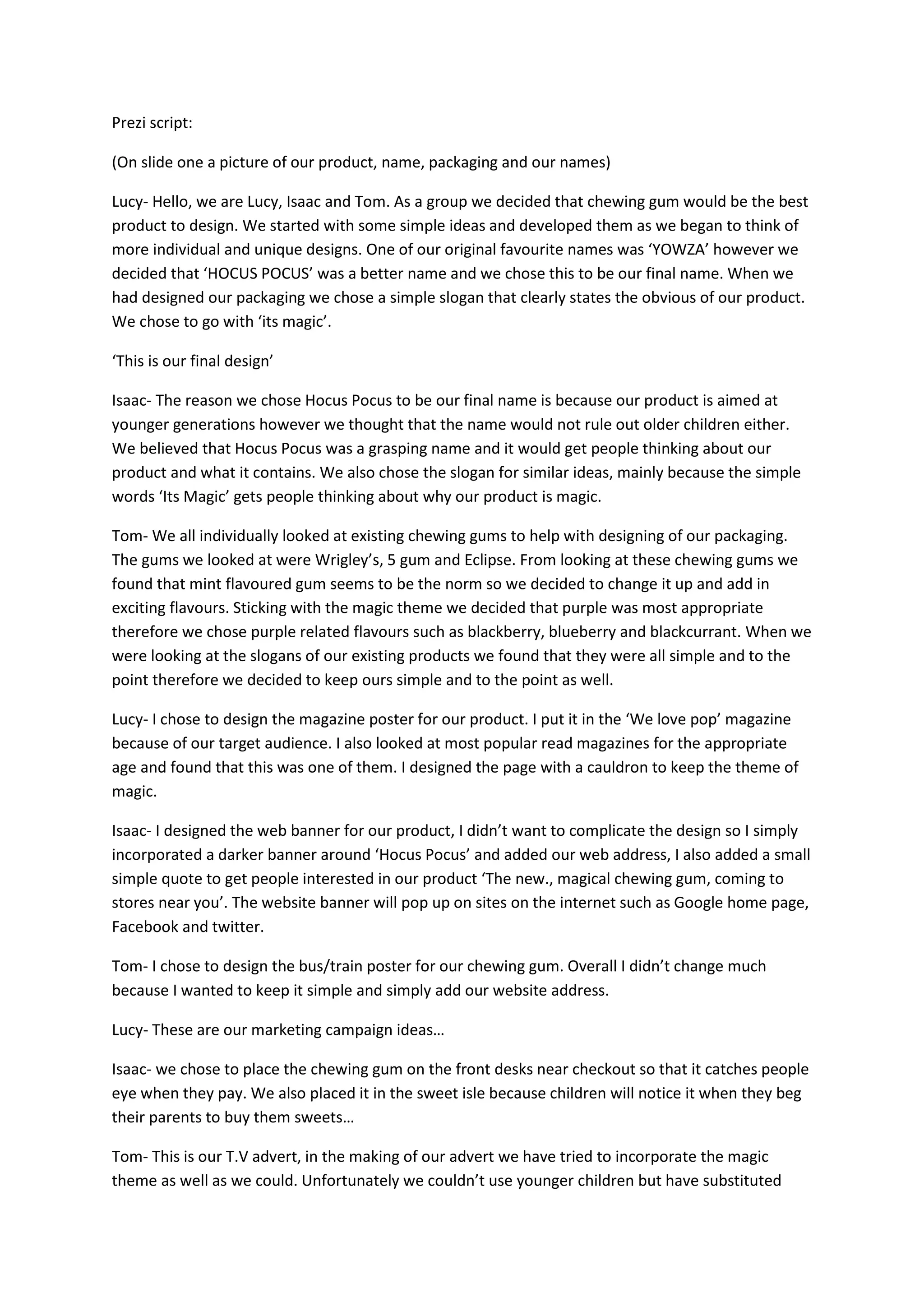The group designed a new chewing gum called Hocus Pocus aimed at younger generations. They chose purple flavors like blackberry, blueberry, and blackcurrant to stand out from mint flavors. Each member designed a different marketing material - Lucy designed a magazine ad, Isaac a website banner, and Tom a bus/train poster. They presented ideas for marketing the gum by placing it near checkouts and in the candy aisle to catch people's eyes. Tom also shared their TV commercial incorporating the magic theme through substitutes when they couldn't use younger actors.