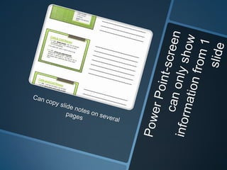 This document discusses how too much text or too many pictures can detract from a concept in a presentation, and that you still need to captivate your intended audience through scaffolding and graphic organizers while knowing your presentation well.