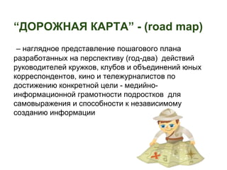 Документ описывает презентацию 'дорожной карты' медийной и информационной грамотности для подростков, которая будет представлена на вебинаре 22 октября 2014 года. 'Дорожная карта' включает в себя пошаговый план мероприятий для достижения медийно-информационной грамотности, включая разные уровни навыков и цели. Также имеется информация о платформе Prezi, критериях оценивания результатов и контактных данных организаторов.