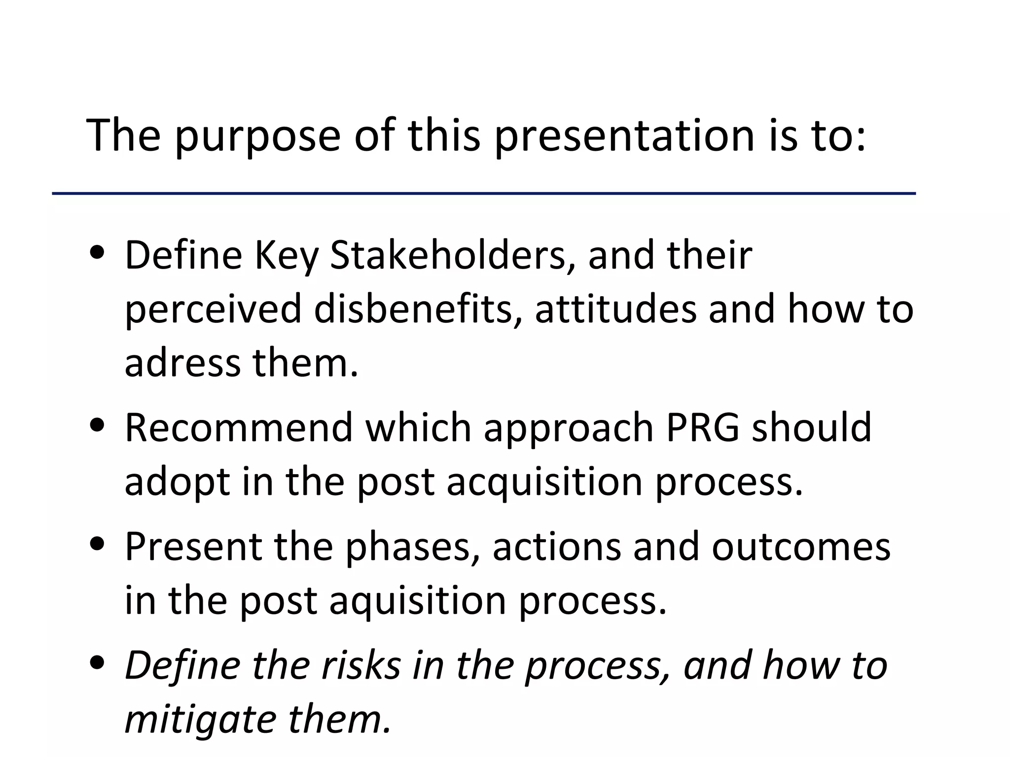 The presentation defines key stakeholders and their concerns, recommends an approach for post-acquisition management, and outlines the process. It addresses: