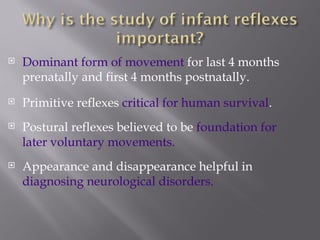 The document discusses primitive and postural reflexes crucial for human development, describing their characteristics, classifications, and roles in survival. It emphasizes that these reflexes are vital indicators of neurological function and assist in voluntary movement development. The text details various reflexes, including their stimuli and responses, as well as the timing of their appearance and disappearance during infancy.