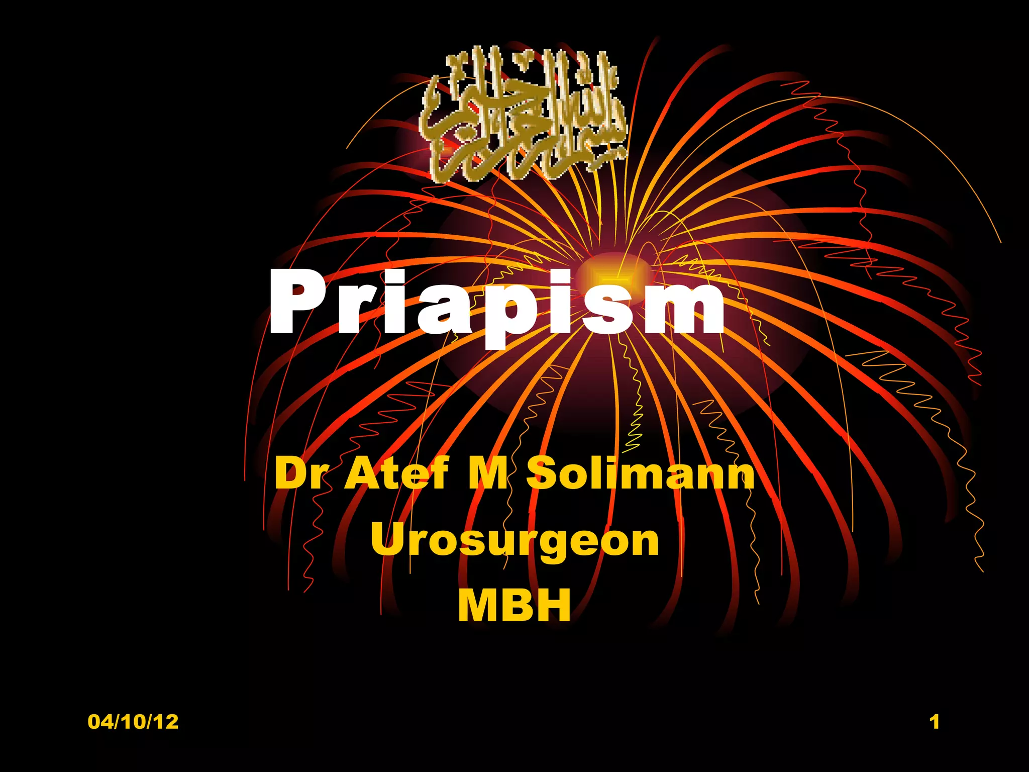 The document discusses priapism, beginning with definitions and epidemiology. It then covers etiology, natural history, pathology, pathophysiology, classification, diagnosis, treatment, and complications of priapism. The key points are that priapism can be ischemic (low flow) or nonischemic (high flow) and treatment involves relieving the ischemia through aspiration or shunting for ischemic priapism or selective arterial embolization for nonischemic priapism.