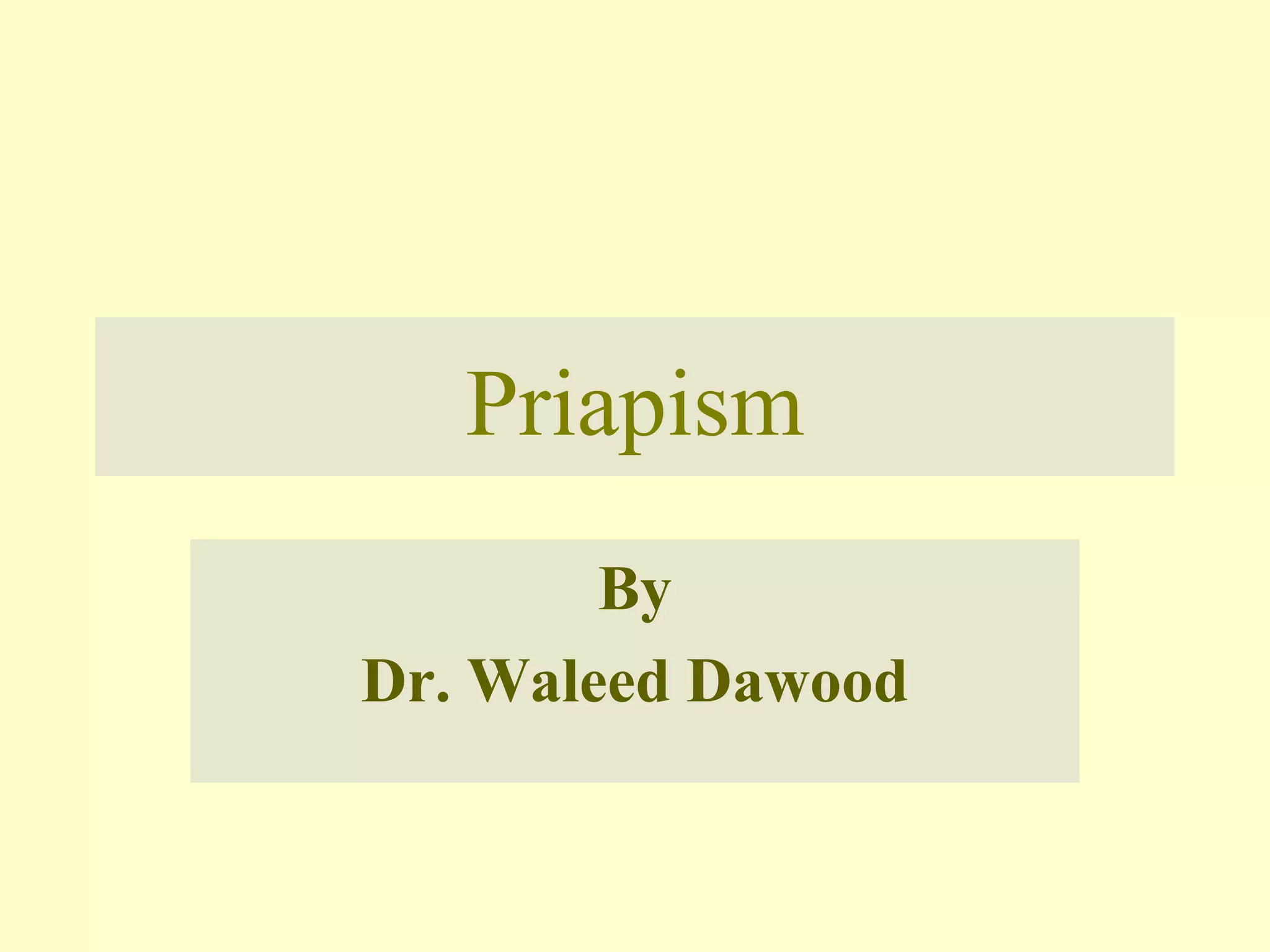 Priapism is a persistent erection not caused by sexual stimulation that lasts over 6 hours. It is classified as low-flow or high-flow. Low-flow priapism is more common and painful due to tissue ischemia. Causes include medications, sickle cell disease, and trauma. Treatment involves aspiration of blood from the corpora followed by injection of medications to restore blood flow. If unsuccessful, surgical shunting procedures may be required to prevent erectile dysfunction. High-flow priapism is less common and usually painless due to direct arterial inflow. Treatment involves embolization of arteries to resolve the erection. Untreated low-flow priapism can lead to permanent erectile dysfunction.