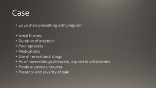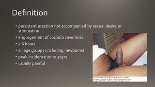 Penile erection begins with relaxation of smooth muscle in the penis which increases blood flow in and decreases flow out. Nitric oxide plays a role in prolonged erections known as priapism. Medications that inhibit an enzyme called PDE can prevent breakdown of cGMP and block the effects of nitric oxide, thereby inhibiting smooth muscle relaxation in the penis.