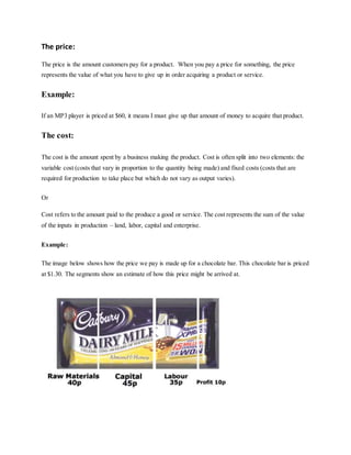 The document discusses the differences between price and cost from an accounting perspective. It defines price as the amount customers pay for a product, representing the value of what they receive. Cost is defined as the amount spent by a business to produce a product, including variable and fixed costs. An example breaks down the various costs that determine the $1.30 price of a chocolate bar, such as raw materials, capital, labor, and profit.