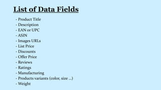 The document promotes an affordable price comparison software for Etsy, offering services such as online directory scraping, data cleaning, and web scraping. It highlights features like fresh databases, sample availability, and data fields for numerous e-commerce platforms including Amazon and eBay. The company specializes in various data services, providing business intelligence and analytics tools.