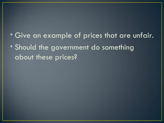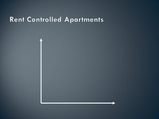 The document discusses price controls and their effects. There are two main types of price controls - price ceilings, which set a maximum price, and price floors, which set a minimum. Price ceilings typically benefit consumers but hurt producers, creating a shortage. Price floors typically benefit producers but hurt consumers, creating a surplus. Examples given are rent control, which is a price ceiling benefiting renters but hurting landlords, and minimum wage laws, which are a price floor benefiting some workers but potentially hurting employment levels.