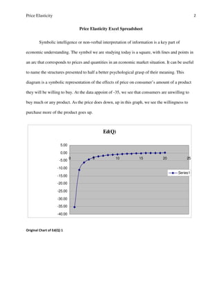 This document analyzes price elasticity through charts and a data set showing the relationship between price and quantity demanded of a product. It summarizes that as price decreases, quantity demanded increases, showing consumer willingness to purchase more at lower prices. The data set adds a summation column for clarity, showing maximum revenue is generated at a quantity of 9 where demand is balanced with price. The analysis advises companies to monitor elasticity in order to maintain profits and market share without damaging demand through excessively high prices.