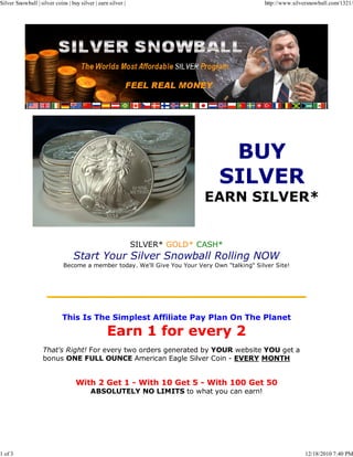 This document advertises for the website SilverSnowball.com, which allows members to earn silver coins and other rewards through referrals. The program pays members 1 ounce of silver for every 2 orders generated by their website, with no limit on earnings potential. It promotes silver as having increased over 300% in 5 years and that earnings will increase as the dollar loses value. Members can earn silver, gold, or cash bonuses by joining and starting to accumulate precious metals through the affordable affiliate program.