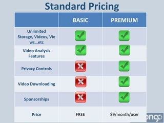 The document outlines different pricing models for a service including a basic free plan and premium paid plans starting at $9/month. It describes standard features included in each plan as well as group and yearly pricing discounts. The service provides triggers to prompt users to upgrade their plan, such as when trying to change a video's privacy settings, feature a user with a basic plan, download videos, or add sponsors.
