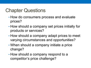 The document discusses pricing strategies and considerations. It begins by outlining key questions around how consumers evaluate prices, how companies should initially set prices and adapt prices over time. It then defines price and discusses factors to consider like customer perceptions of value, cost, and other marketing mix variables. The document also covers types of pricing like value-based, cost-based, good-value pricing and value-added pricing. It outlines the pricing process, including selecting objectives, estimating costs and demand, and choosing a final price. The document concludes by discussing strategies for adapting prices based on factors like location, promotions, and customer segments.