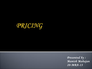 This document discusses pricing strategies and objectives. It outlines the key considerations in setting price, including determining demand, estimating costs, analyzing competitors, and selecting a pricing method. The document notes that companies must first decide on a pricing objective like maximizing profits or market share. It also discusses factors that influence demand elasticity like availability of substitutes. Finally, the document lists several common pricing methods like markup pricing, target-return pricing, and perceived-value pricing that companies can use to determine the final price.