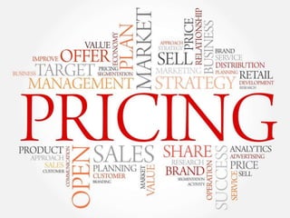 1. Pricing is the process of determining the amount a buyer will pay for a product or service, and is affected by factors like production costs, demand and utility, competition, and government regulations.