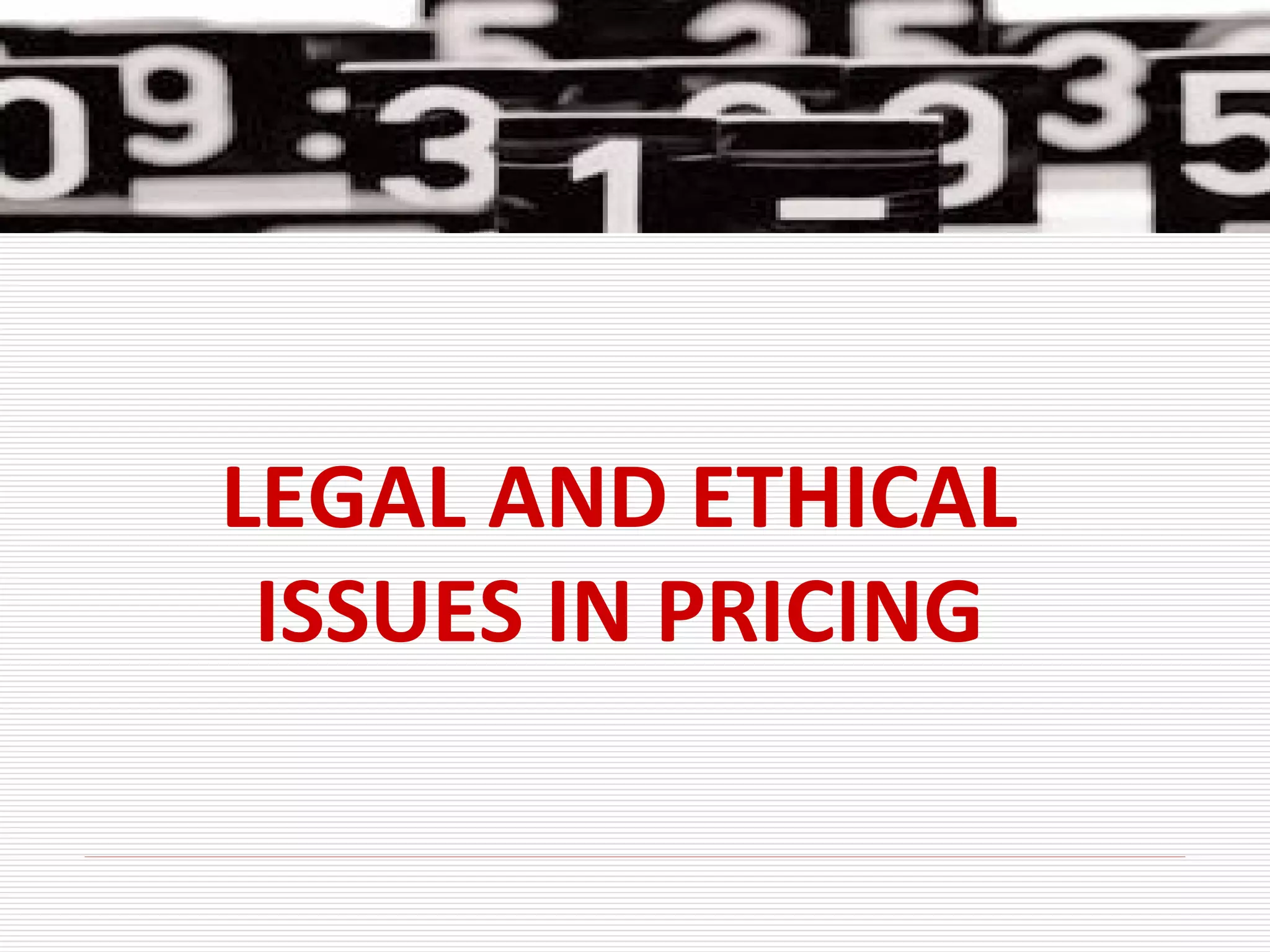 This document discusses several legal and ethical issues related to pricing, including: