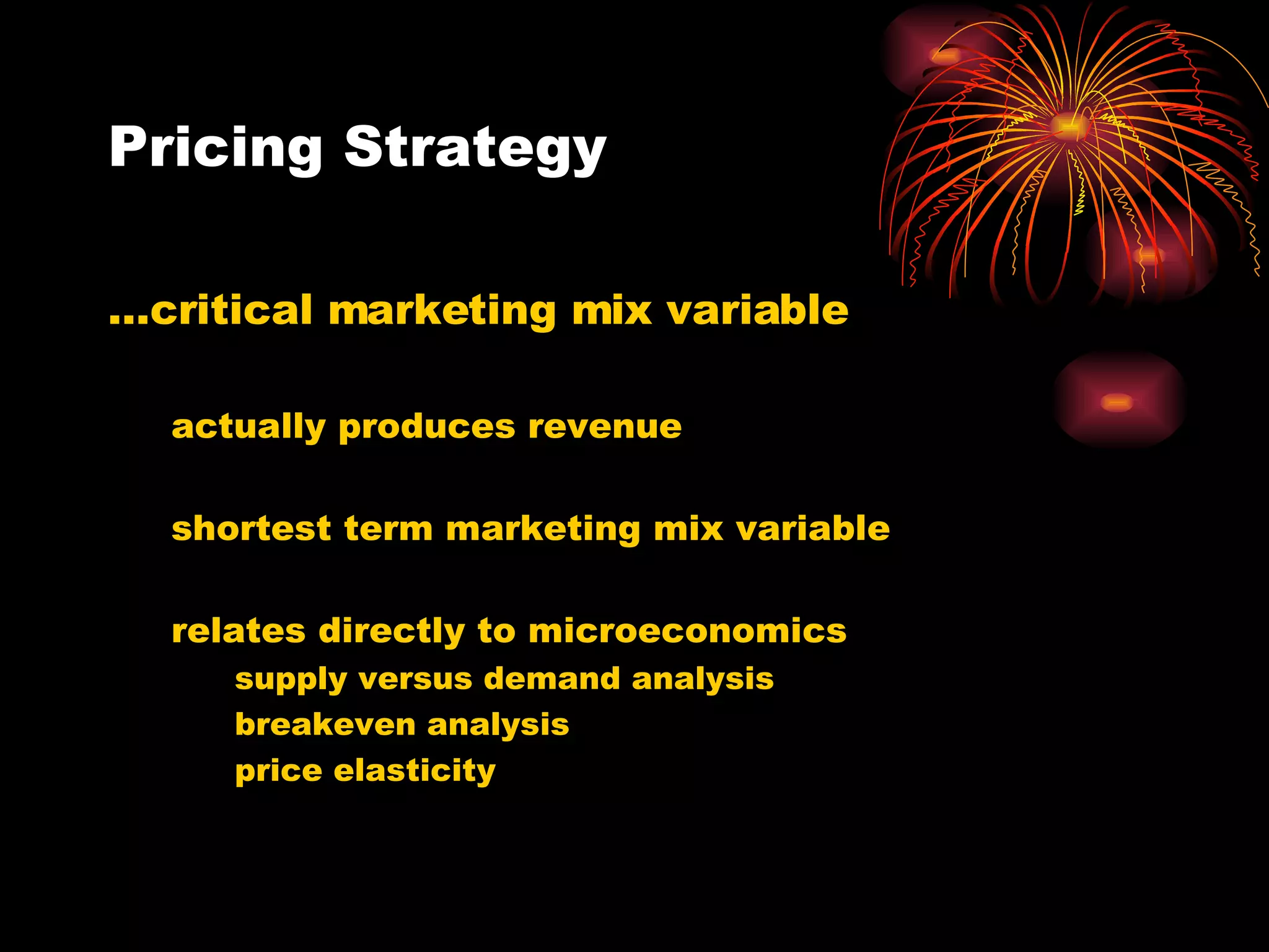 The document discusses pricing strategies and how to improve profit performance. It covers analyzing supply and demand curves, estimating costs and demand, analyzing competitors' prices, and selecting a pricing policy. Various pricing objectives and methods are described, such as cost-based pricing, demand-based pricing, and competition-based pricing. The impact of price increases and decreases on revenue, costs, and profits are also examined.