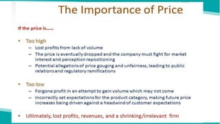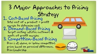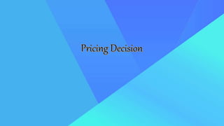 Pricing is an important business decision that directly affects revenues. There are many internal and external factors that must be considered when setting prices, including objectives, costs, competition, and demand. Some common pricing strategies include penetration pricing, premium pricing, bundle pricing, psychological pricing, promotional pricing, and dynamic pricing. The objectives and factors affecting price are analyzed to determine the optimal pricing strategy.