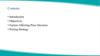 This document discusses pricing strategies and factors that affect pricing decisions. It begins by defining price and explaining that pricing is an important business decision. It then outlines various objectives of pricing, internal factors like costs and product differentiation, and external factors like competition and demand. The document also explains different pricing strategies such as penetration pricing, premium pricing, bundle pricing, and dynamic pricing. It concludes that setting objectives is important for determining appropriate pricing strategies.