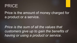 The document discusses pricing as the monetary value charged for products or services and outlines its objectives, including profit maximization and market share. It details various internal and external factors influencing pricing decisions and describes several pricing methods such as cost-based, demand-based, and competition-based pricing. Additionally, it explains concepts like price discrimination and value-based pricing, emphasizing the importance of perceived value in setting prices.