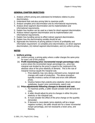 This chapter discusses pricing policies from uniform pricing to price discrimination. It begins by explaining uniform pricing and its profit-maximizing price point where marginal revenue equals marginal cost. More profitable policies include direct and indirect price discrimination between identifiable customer segments. The most profitable is complete price discrimination, charging each customer the maximum they are willing to pay. Location is commonly used for direct discrimination between markets.