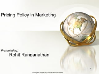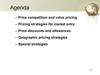 The document discusses pricing policy in marketing, outlining the importance of pricing as a key element of the marketing mix that must reflect supply and demand. It details various pricing strategies, including price competition vs. value pricing, market entry strategies, and the psychological aspects of pricing. Additionally, it covers factors influencing pricing decisions such as costs, competition, discount strategies, and legal considerations like predatory pricing and price discrimination.
