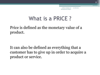 This document discusses pricing strategies and factors that affect pricing. It begins by defining price and the role of pricing in marketing strategy. It then provides examples of skimming pricing and penetration pricing strategies used by companies like Apple, Sony, and Maybelline. The document also discusses how pricing can be used as a demand regulator, revenue generator, competitive tool, and for product positioning. Finally, it outlines internal factors like marketing objectives and costs, and external factors like demand, competition, and the market that affect pricing decisions.