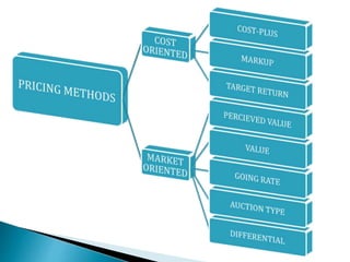 The document outlines pricing strategies and considerations for businesses, detailing both internal and external factors that influence pricing decisions. It covers various pricing methods such as cost-oriented and market-oriented pricing, including penetration and market skimming strategies. Ultimately, the guide serves as an educational resource for understanding how to effectively set prices in different market conditions.
