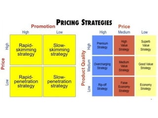 This document discusses various pricing strategies and considerations. It begins by explaining that price cannot be determined in isolation and is determined by the intersection of what the buyer and seller value. It then discusses 3 main determinants of pricing: 1) the value to the customer, 2) the seller's costs, and 3) the influence relationship between buyer and seller. The document goes on to describe different pricing strategies such as skimming, penetration, maintaining price, increasing or decreasing price for new and established products. It also discusses flexible pricing, product line pricing, leasing, bundling, price leadership, and strategies to build a market.