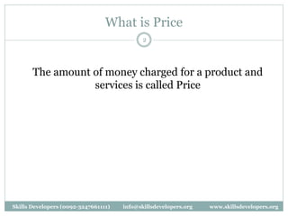 The document discusses various pricing techniques used by companies to maximize profits. It describes different cost-based pricing methods like cost-plus pricing, full cost pricing, and marginal cost pricing. Other pricing strategies covered include demand-based pricing techniques like skimming pricing and penetration pricing. The document also discusses break-even analysis and how to determine pricing based on competition in the market. A variety of factors are highlighted that companies should consider when determining prices.