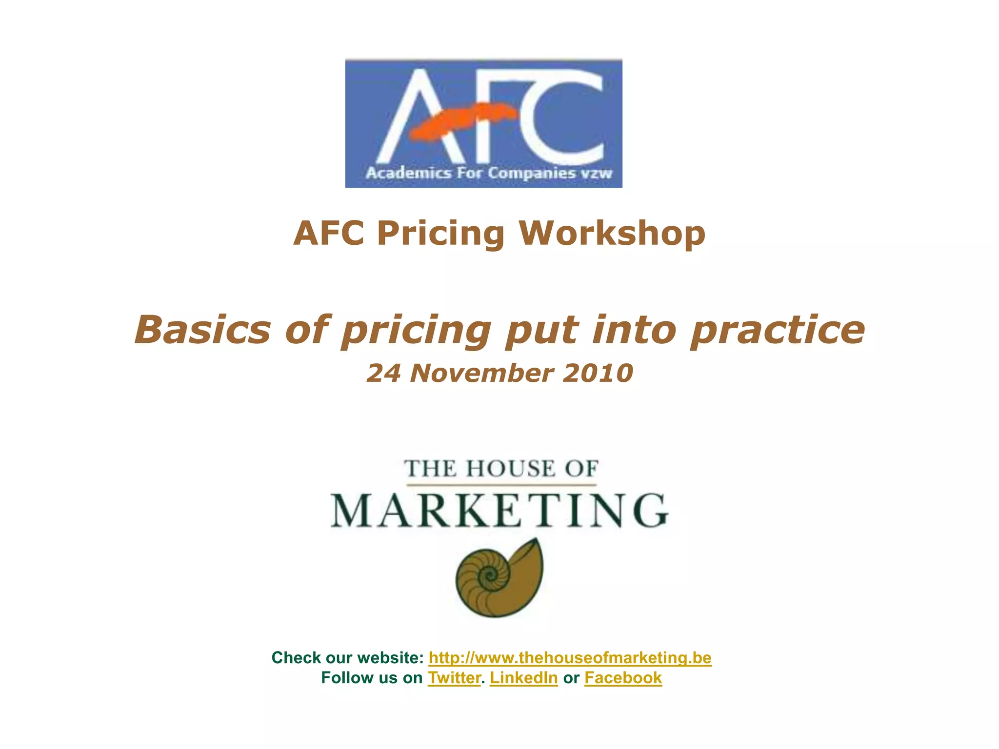 The document summarizes an agenda for an AFC Pricing Workshop on basics of pricing put into practice that will be held on November 24, 2010. It will include an introduction, a session on pricing basics, and a case study on Continental Courier. The House of Marketing is a marketing consultancy that provides expertise in strategic and operational marketing areas to clients across many sectors. Pricing is an important lever to increase profits but organizations often face challenges in pricing strategy and execution including misalignment between departments and not effectively communicating value to customers. The workshop will discuss determining customer value and costs, as well as identifying competitive scenarios, to help set optimal prices.