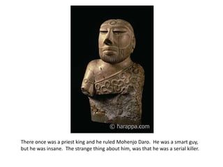 The priest king of MohenjoDaro was a serial killer who enjoyed drowning his victims in his large bath. Though insane, the townspeople liked him until he grew to dislike them and invented torturous games. The people eventually grew angry with the priest king and went to war with him before a peace treaty was signed. After the priest king's death, the townspeople erected a statue of him.